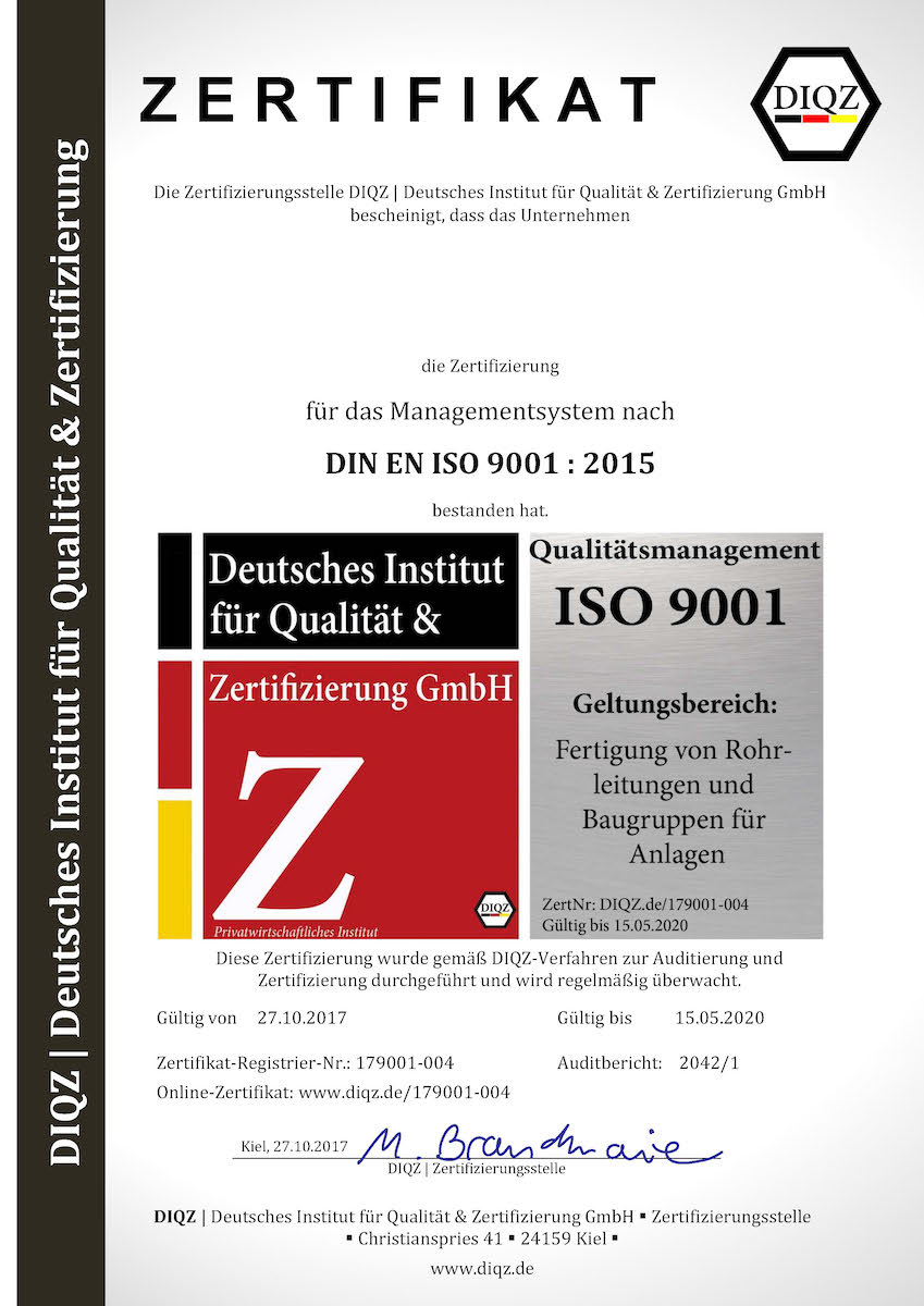 Bei meinen Recherchen im Internet bin ich unteranderem auf die Firma DIQZ Deutsches Institut für Qualität & Zertifizierung gestossen. Die DIQZ zertifiziert Unternehmen nach ISO 9001 und ISO 14001. Sie erhalten nach bestandener Konformitätsbewertung ein Zertifikat mit einer Gültigkeit von 3 Jahren, mit jährlicher Überprüfung, ausgestellt.