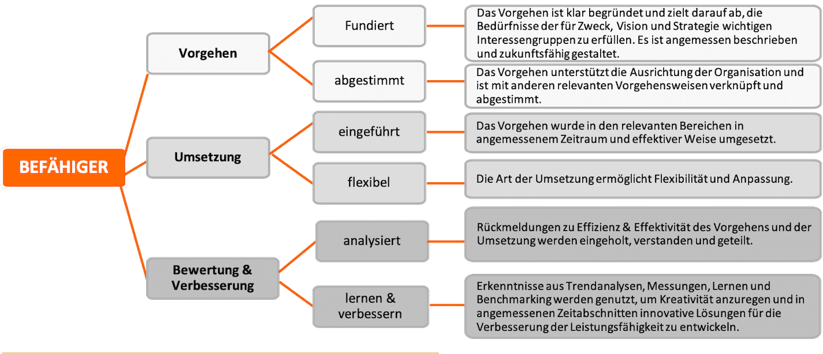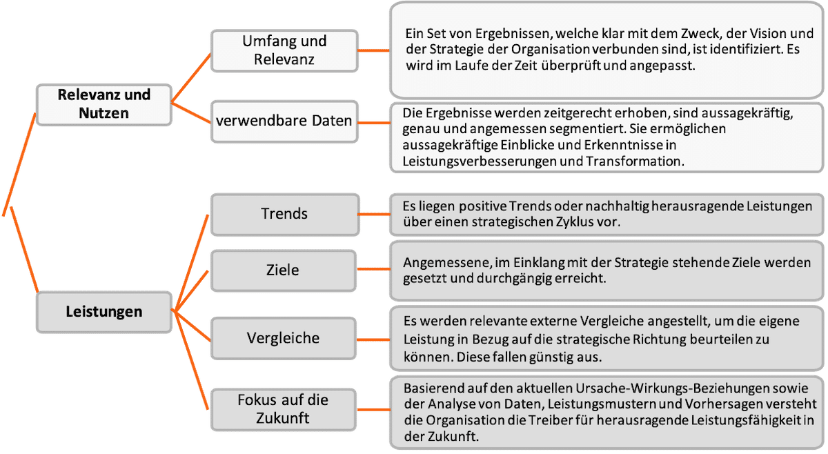 Ein Set von Ergebnissen, welche klar mit dem Zweck, der Vision und der Strategie der Organisation verbunden sind, ist identifiziert. Es wird im Laufe der Zeit überprüft und angepasst