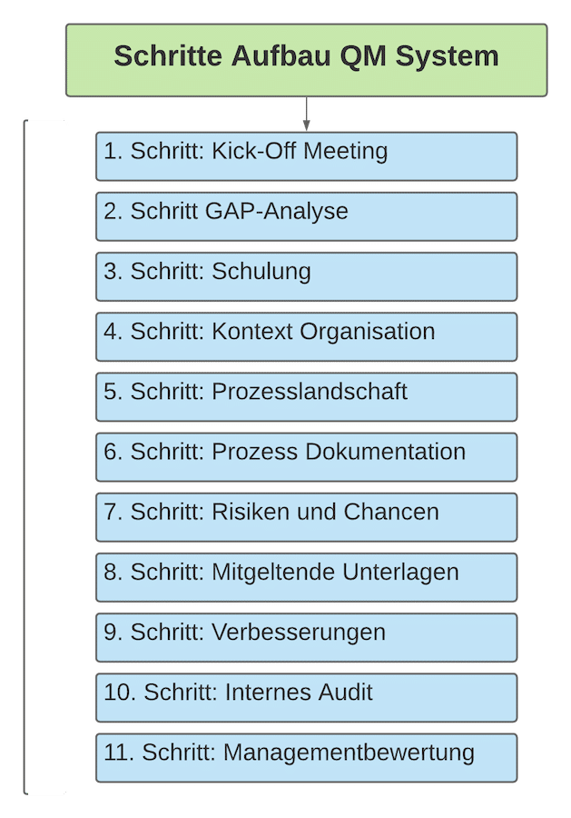 Das Fallbeispiel Einfuehrung QM System zeigt, wie man in 11 Schritten die Einführung strukturiert in Arbeitspaketen durchführen kann. Bei der Einführung war der Berater Moderator und aktiver Mitarbeiter in einer Person.