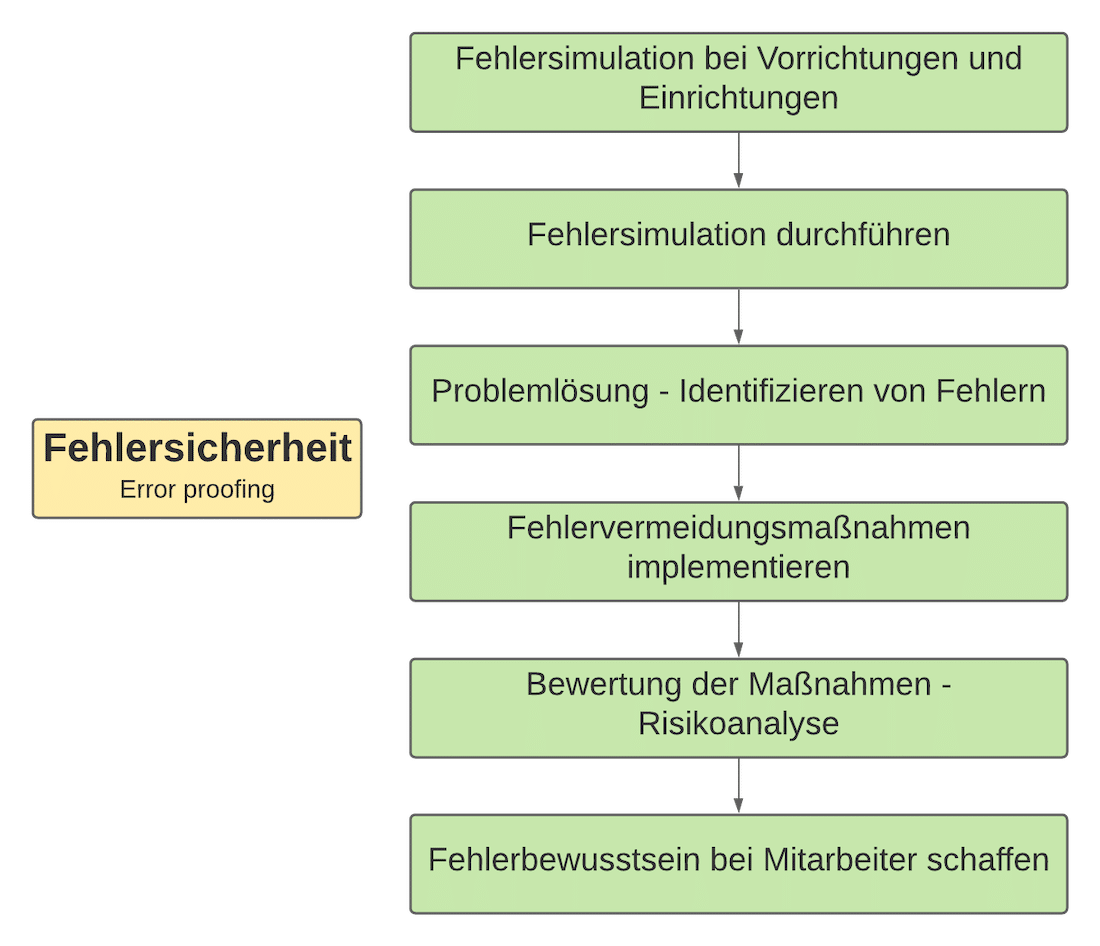 Im Prinzip versteht man unter Fehlersicherheit nichts anderes als mit Poka Yoke vor der Inbetriebnahme der Vorrichtung oder Einrichtung beherrschbare Bedingungen herzustellen. So das im vornherein das Auftreten von Fehlern verhindert wird. Wo das nicht möglich ist müssen die Mitarbeiter unterwiesen werden welche Fehler auftreten könnten.