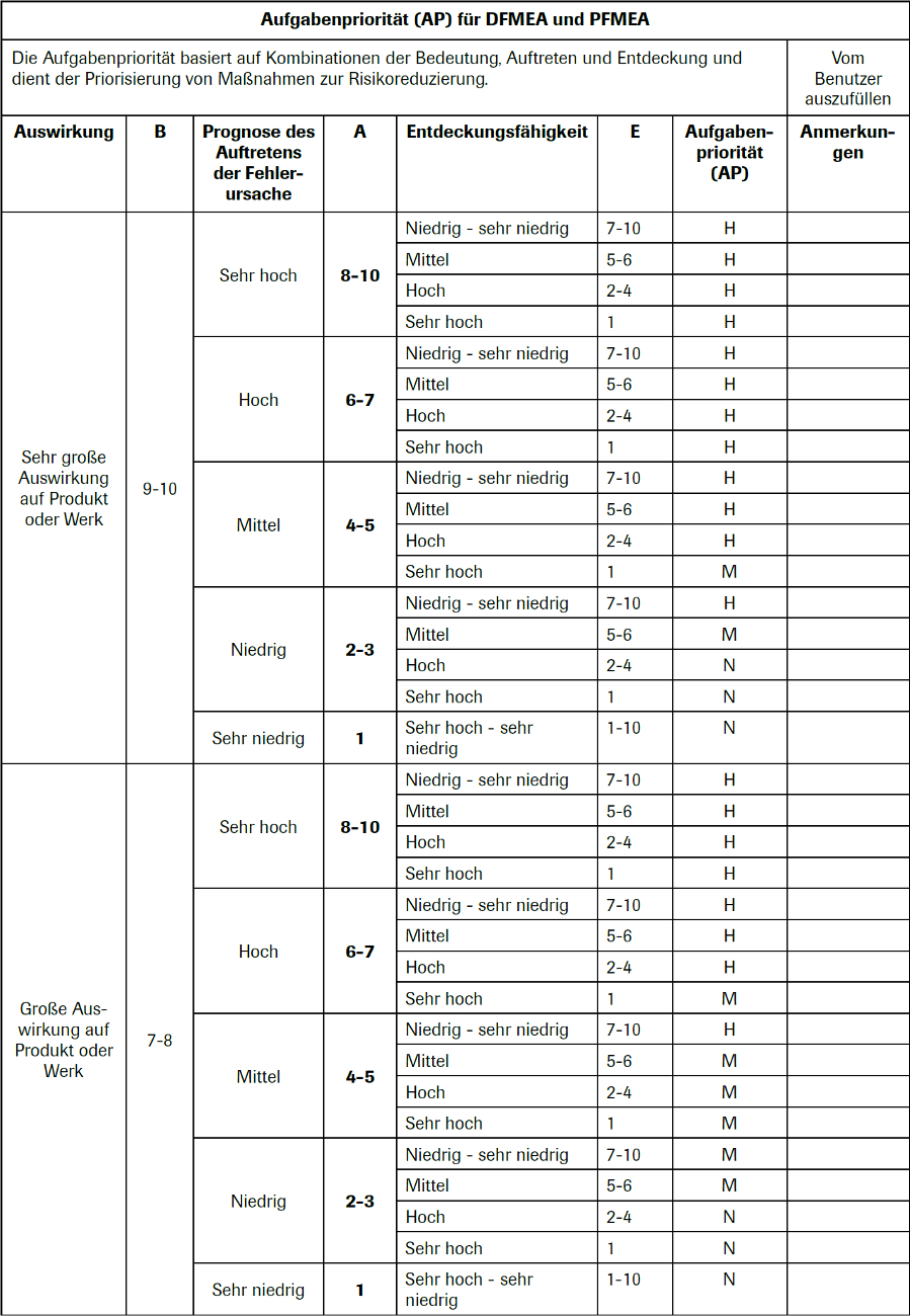 Aufgabenpriorität AP für DFMEA und PFMEA