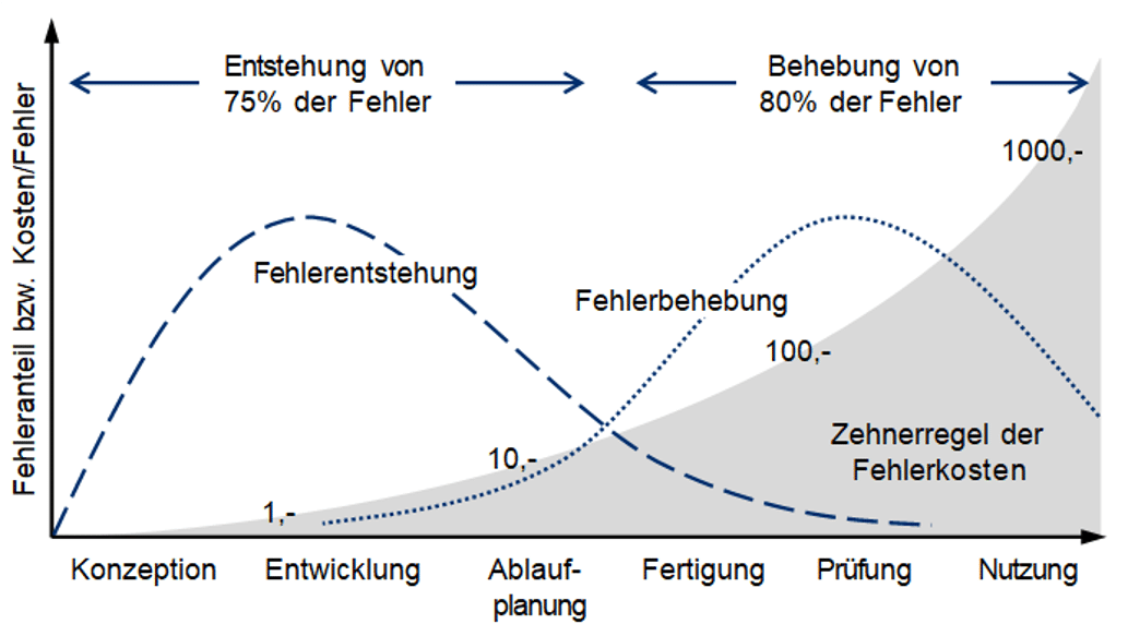 Die konsequente Vermeidung von Fehlern ist immer wirtschaftlicher als die nachträgliche Fehlerbehebung. Im Allgemeinen gilt: Je später ein Fehler entdeckt wird, desto kostenintensiver und schwieriger ist dessen Korrektur, was durch die sog. „Zehnerregel der Fehlerkosten“ untermauert wird. Sie besagt, dass für jede Phase im Produktentstehungsprozess, die ein Fehler später entdeckt und behoben wird, die Kosten zur Fehlerbeseitigung um eine Zehnerpotenz zunehmen.
