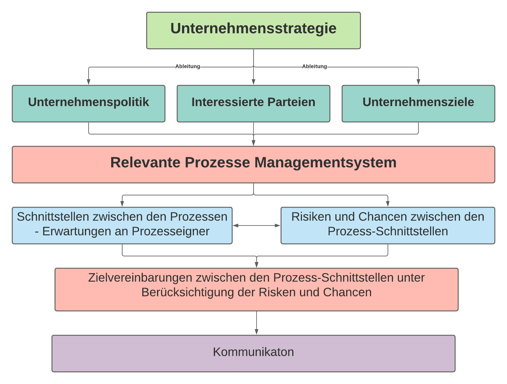 Weiterhin werden Ressourcen benötigt und das notwendige Know-How. Beides muss oder kann nur die Unternehmensleitung in ausreichenden Maße zur Verfügung stellen. Auch hier sind wieder Erwartungen der anderen Prozesseigner, diesmal an die Unternehmensleitung. Auch hier lassen sich die Erwartungen wieder in konkrete Ziele und Risiken umlegen. Eines der Risiken könnte sein, dass das Produkt der Vorentwicklung keine Marktreife bekommt, weil sich der Markt in der Zwischenzeit verändert hat oder weil das Produkt keine Marktreife besitzt.