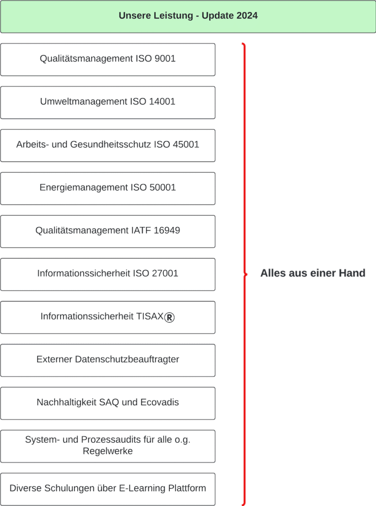 In Zukunft werden Kunden zunehmend die Einhaltung strenger Normen und Regelwerke von ihren Lieferanten fordern. Unsere ISO Management Dienstleistungen helfen Unternehmen, diese hohen Erwartungen zu erfüllen, indem sie Qualität, Effizienz und Sicherheit gewährleisten. Unser Portfolio bietet eine Vielzahl an ISO Dienstleistungen, die Unternehmen dabei unterstützen, die höchsten Standards zu erreichen. In diesem Blogartikel stellen wir Ihnen unsere wichtigsten ISO Management Dienstleistungen vor.